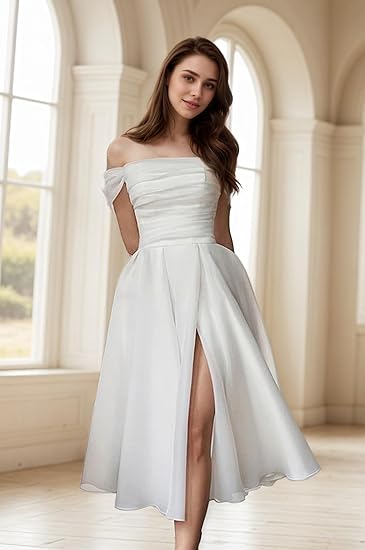 Ta damska sukienka z odkrytymi ramionami łączy klasyczny fason z nowoczesnym krojem. Drapowany dekolt odkrywa ramiona, a rozcięcie z przodu nadaje lekkości i swobody ruchu. Model odpowiedni na uroczystości i formalne spotkania.